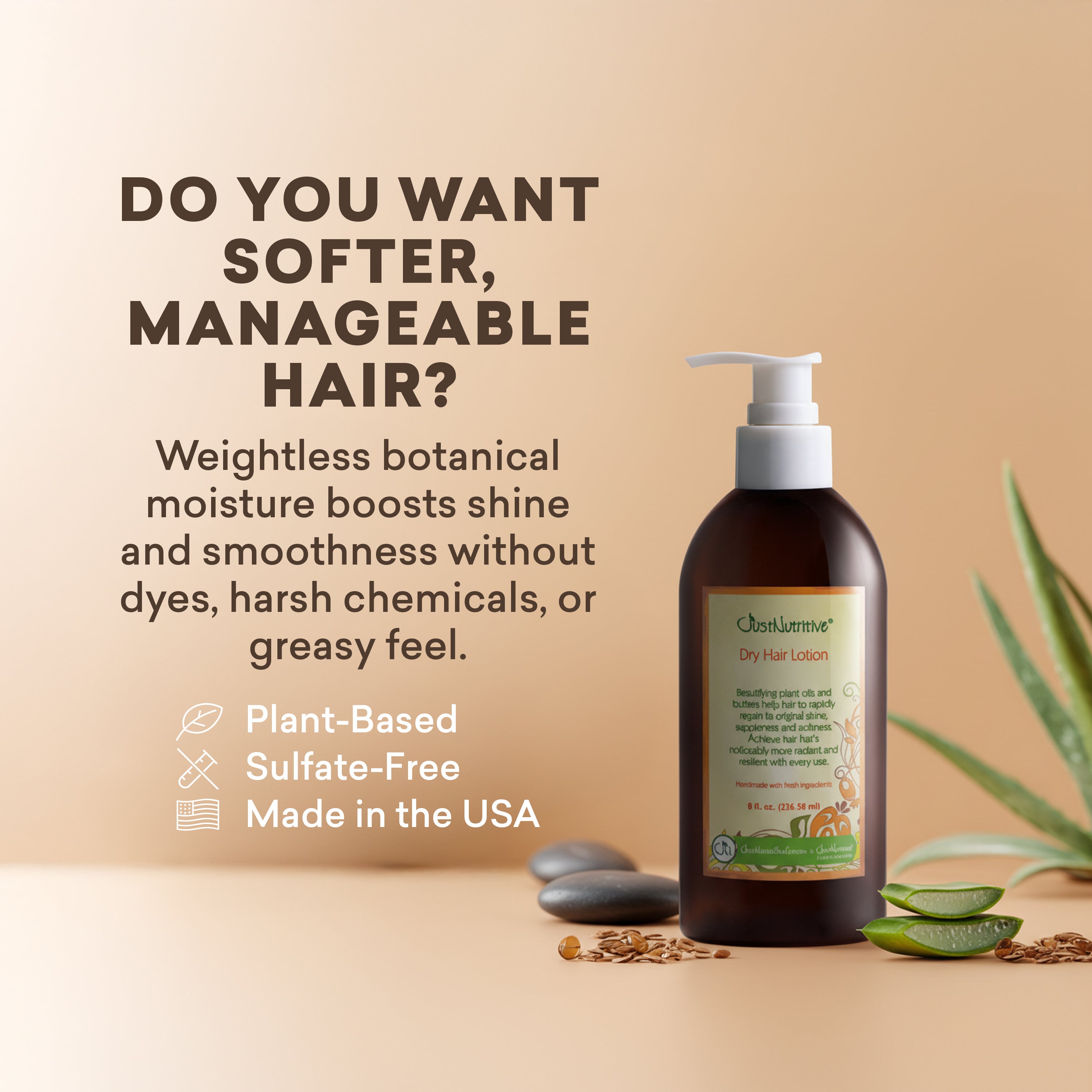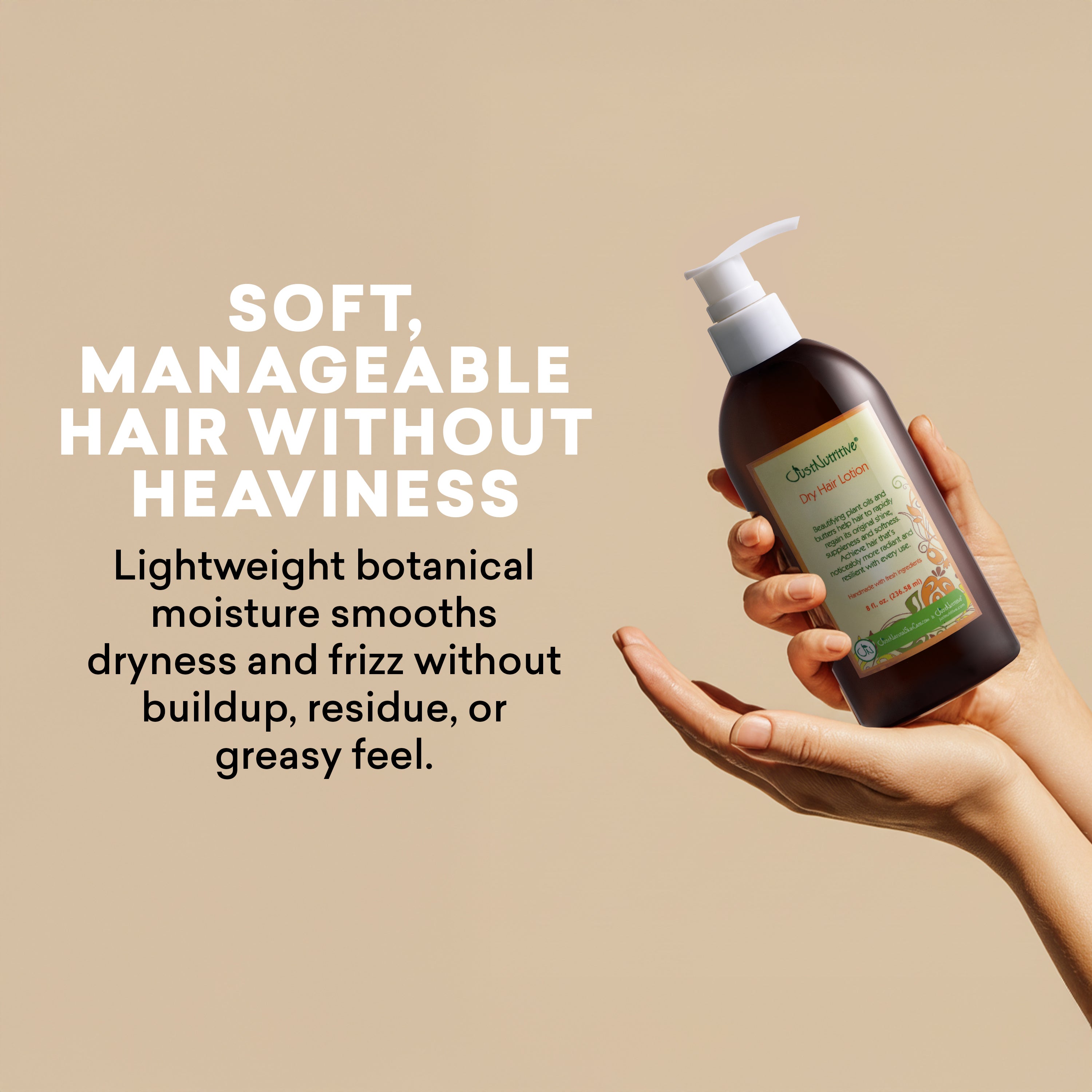 Introducing our weightless Dry Hair Lotion with herbal oils and butters, your solution for achieving beautiful, moisturized-looking, and shiny hair effortlessly. This lightweight lotion works to nourish your hair without weighing it down. Crafted with a blend of nutritious ingredients that provide essential moisture, sheen, and smoothness to your locks. Formulated to help seal in moisture for lasting vibrancy, support against sun and wind exposure, and help comfort hair from the effects of chlorine in swimming pool water, this versatile lotion offers comprehensive hair care benefits. Enriched with nature's best ingredients rich in vitamins and nutrients, it feeds and hydrates dry hair, leaving it looking revitalized and replenished. Suitable for all hair types, including chemically treated hair, our Dry Hair Lotion helps support the appearance of smoother hair, helps reduce the appearance of frizz, and infuses your hair with quenching moisture for a lustrous sheen that lasts.