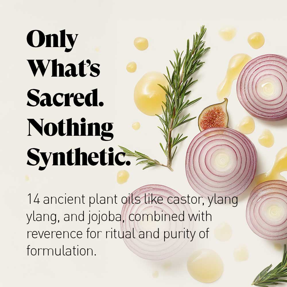Follow with the Onion & Rosemary Growth Oil, a concentrated blend of 14 ancestral plant oils including castor, flaxseed, jojoba, and avocado. It absorbs quickly to support scalp health, minimize visible shedding, and nourish follicles from the root while honoring the power of touch through daily scalp massage.