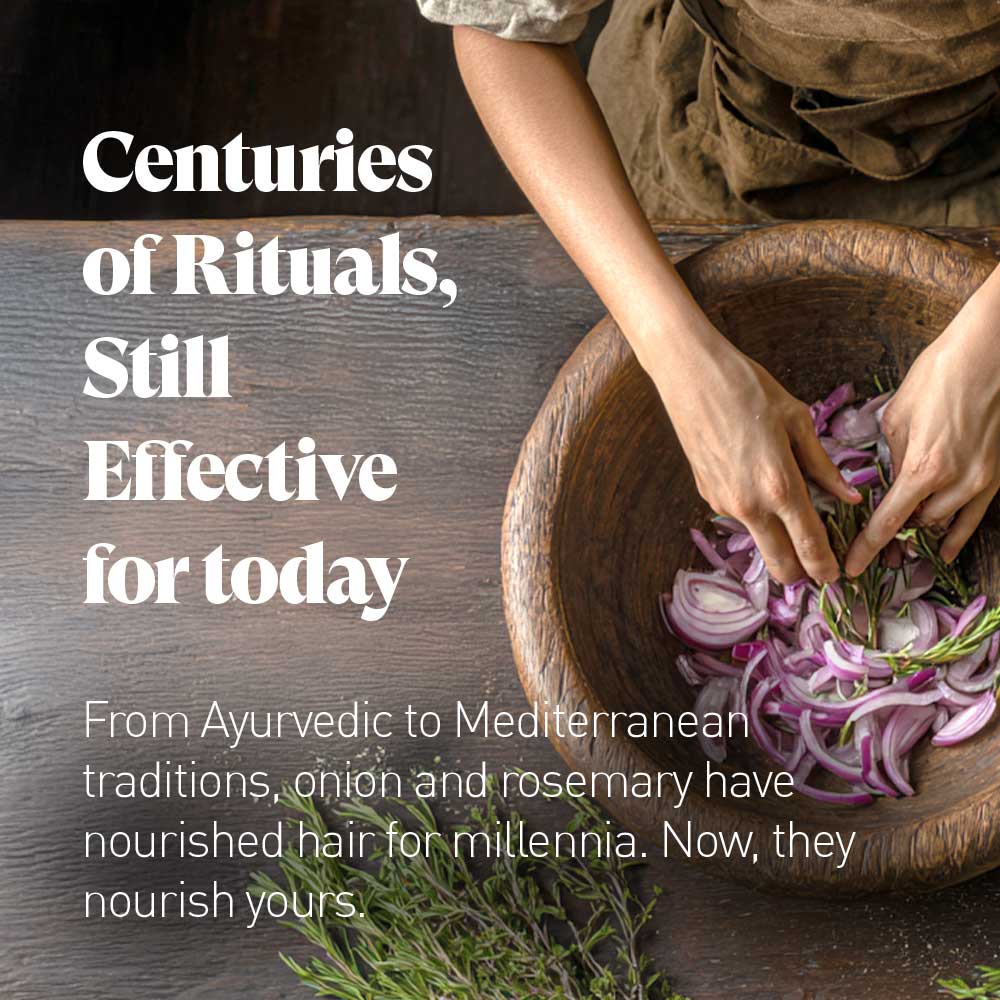 Two Rituals. One Purpose. Rooted Strength, Revived Growth. For centuries, women from India to the Mediterranean turned to the oils of red onion and rosemary to nourish hair, calm the scalp, and protect what they’d grown. This duo revives those ancient practices brought together in a modern ritual designed to purify, replenish, and awaken your roots.